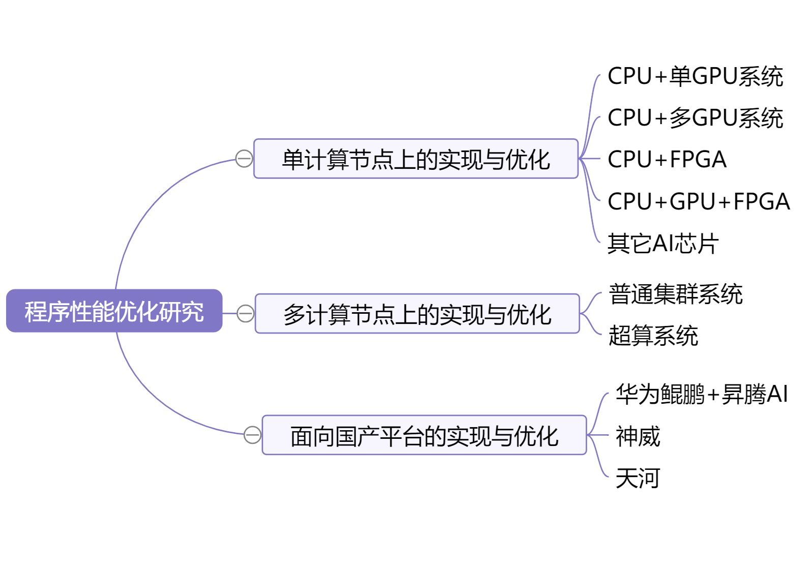 研究所主要从事计算机系统领域相关技术研究,即上图中虚线下方的计算机系统软硬件设计研究,以“高性能、低功耗、安全、可靠、易用、可扩展”为设计目标,探索新型微处理器体系架构、基础软件的实现与优化。具体科研方向如下: