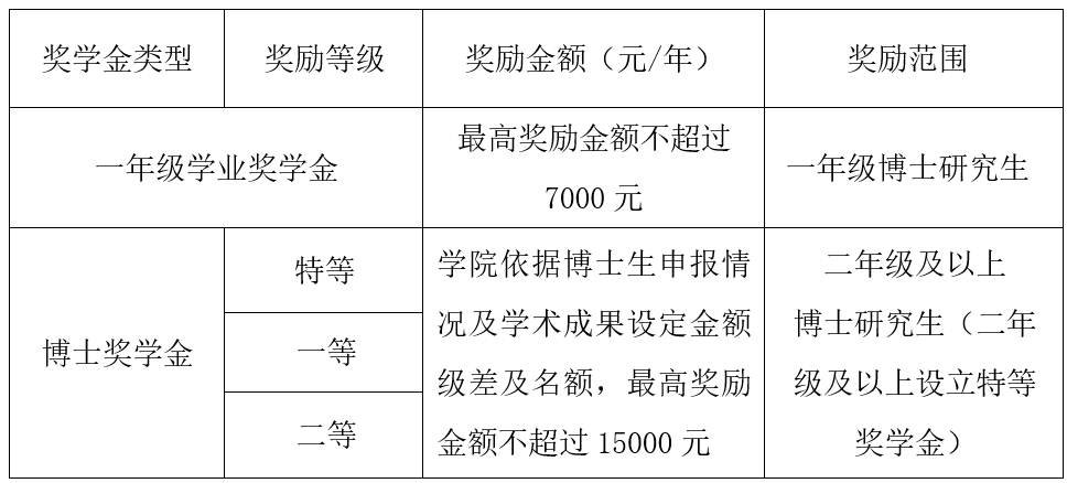 2019级、2020级、2021级、2022级和2023级博士分为特等学业奖学金、一等学业奖学金与二等学业奖学金。