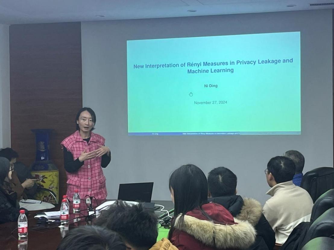 2024年11月27日,奥克兰大学丁妮博士应伟德bv国际体育邀请,在中心教学楼举分别作题为“隐私泄露与机器学习中的Rényi度量新解释”、“通过Kantorovich最优传输计划实现ε-Pufferfish隐私”的学术讲座,,讲座分别由伟德bv国际体育礼欣老师、胡晶晶老师主持,语言智能与社会计算研究所和网络攻防对抗研究所相关专业方向师生参加了讲座。